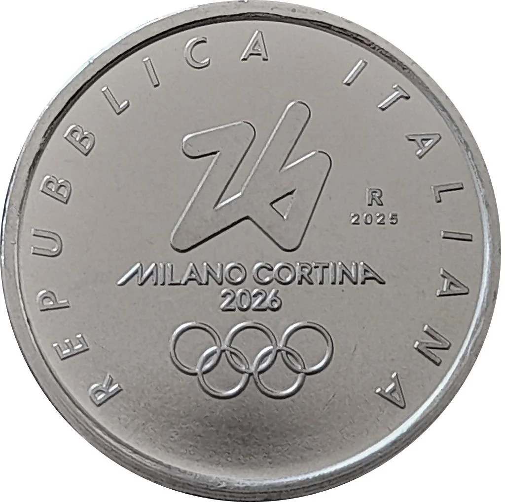 Central: Milano Cortina 2026 Olympic logo. Arching text: "Repubblica Italiana". Right: Mint mark "R" and issue year "2025".