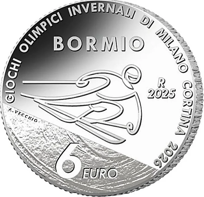 Central alpine skiing pictogram. Above it, "BORMIO". Arching text: "GIOCHI OLIMPICI INVERNALI DI MILANO CORTINA 2026". Right: "R" (Rome Mint) and "2025". Bottom: "6 EURO" and left, engraver "A.VECCHIO".
