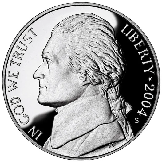 Left-profile portrait of Thomas Jefferson, 3rd U.S. President (1801–1809), encircled by "LIBERTY" and the motto "IN GOD WE TRUST."