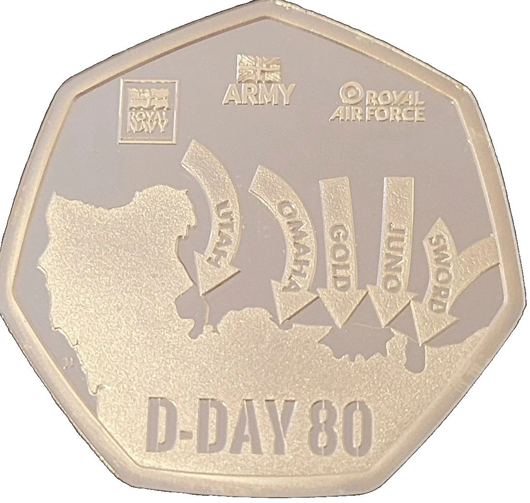 Depicts the Normandy coastline with approach routes to the five beaches and the emblems of the Royal Navy, Army, and Air Force.