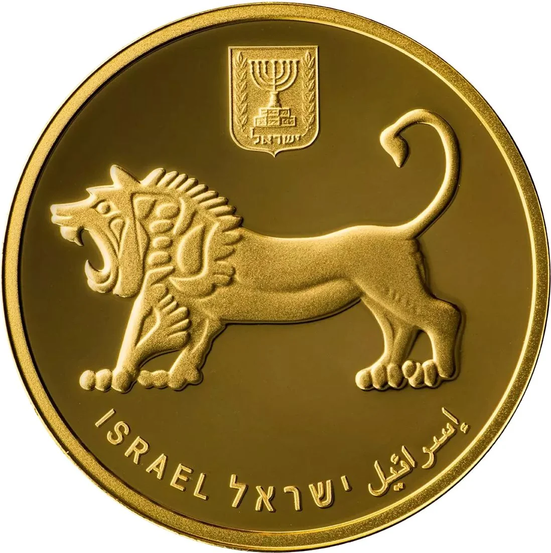 Description: Front view of Hebrew University on Mount Scopus with its emblem, set against Jerusalem hills and cypress trees. Includes face value, mint year, and Star of David mintmark above. Borders show gold fineness, weight, and "Jerusalem" in English, Hebrew, and Arabic.