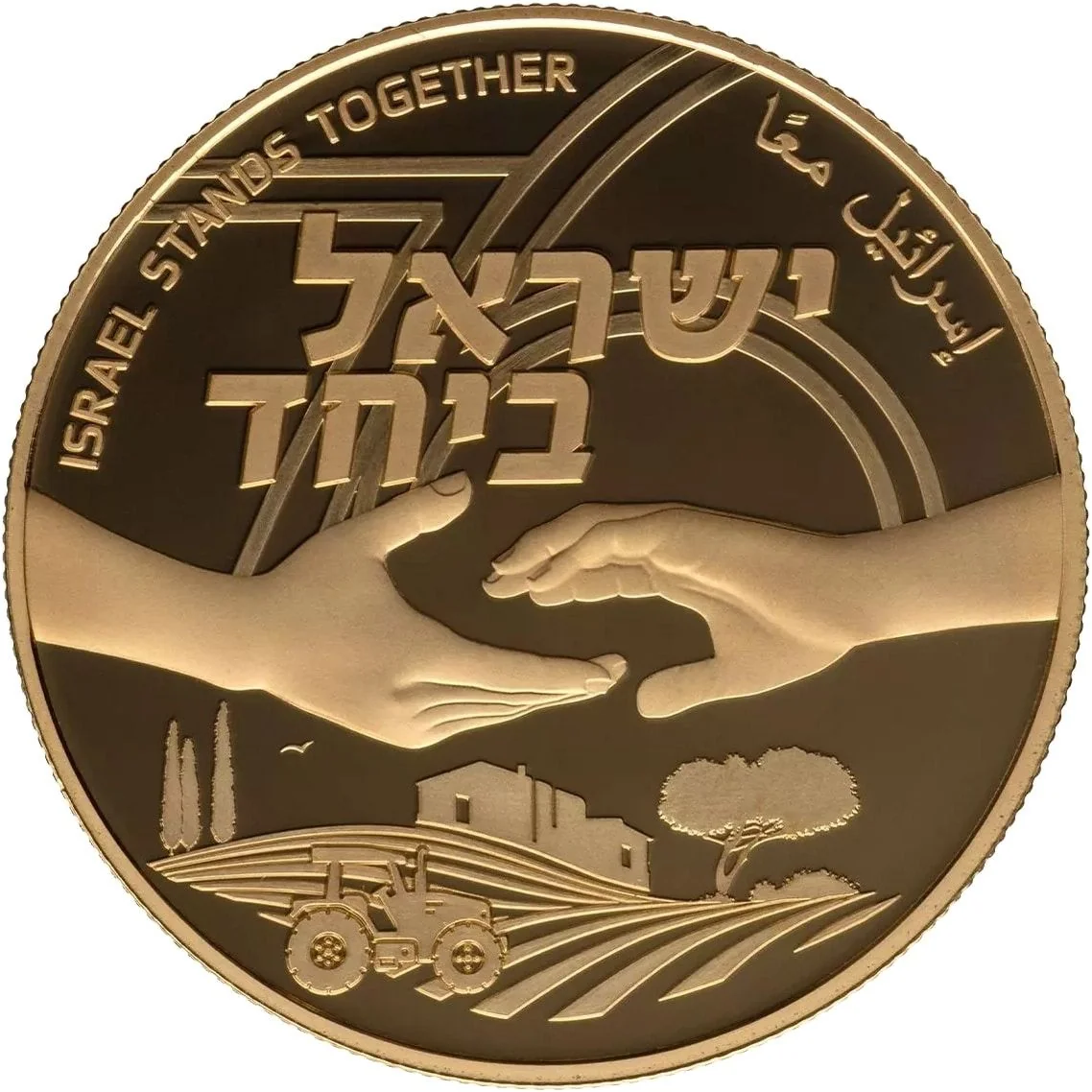 Israel's emblem with "Israel" in English, Hebrew, and Arabic, "Independence Day 2024" in English and Hebrew, face value, mint mark, and joined hands motif.