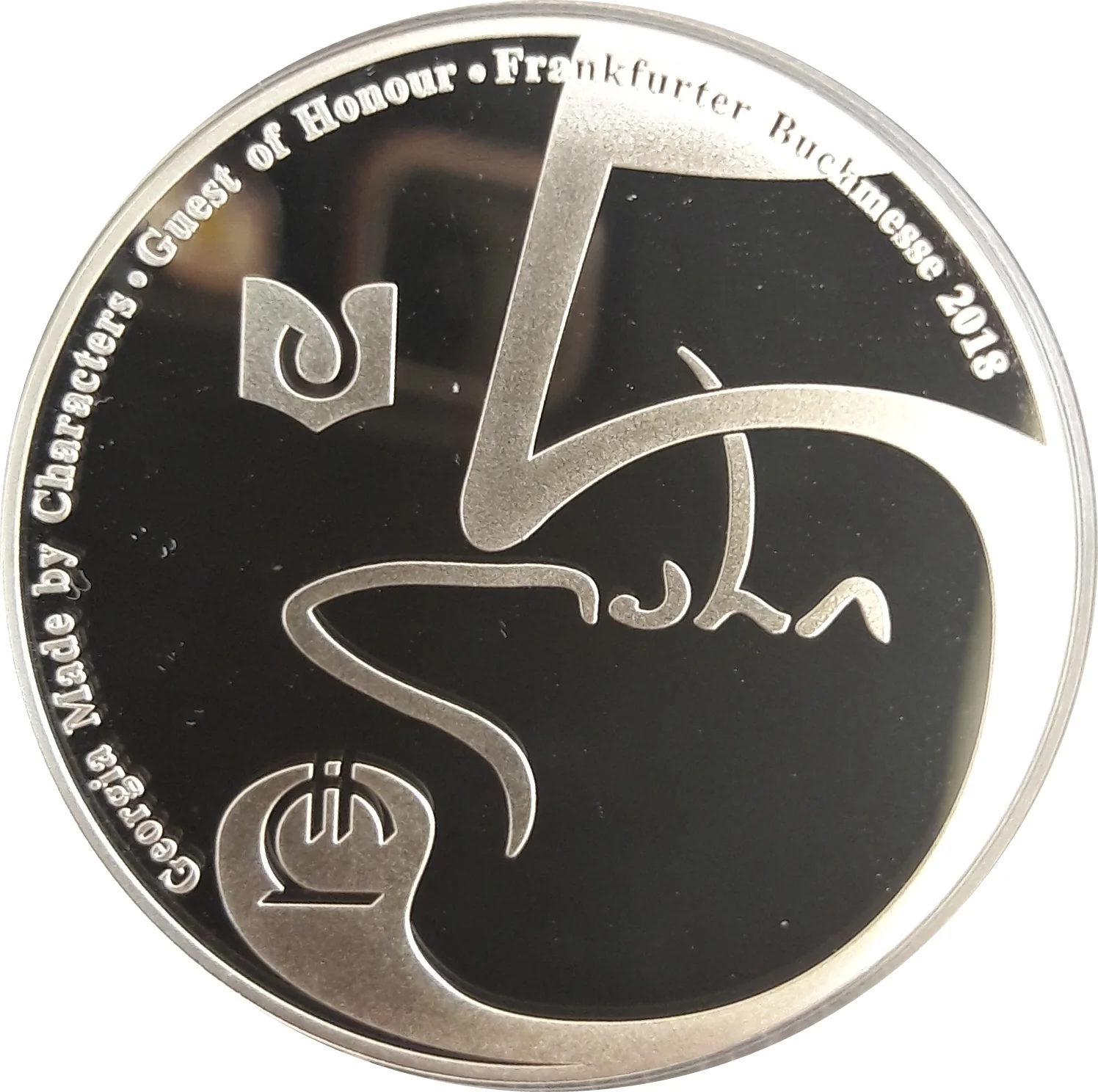 Description: The central design combines the Lari symbol and Georgia’s 2018 Frankfurt Book Fair logo (a stylized “ა”), encircled by text in German and English.