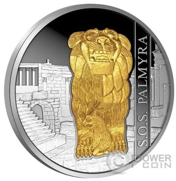 Gilded lion with Palmyra ruins.