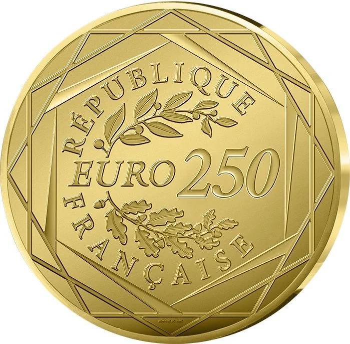 "250 EURO" flanked by laurel and oak branches, encircled by "RÉPUBLIQUE FRANÇAISE" in three hexagons and the year.