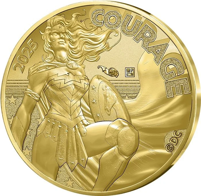 The coin's main motif features Wonder Woman's bust in a determined pose, holding her shield. "COURAGE" is inscribed on the right, and "2025" is at the top left.