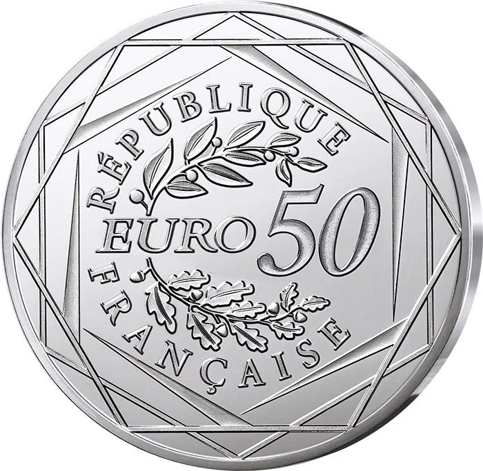 "50 EURO" flanked by laurel and oak branches, encircled by "RÉPUBLIQUE FRANÇAISE" in three hexagons and the year.