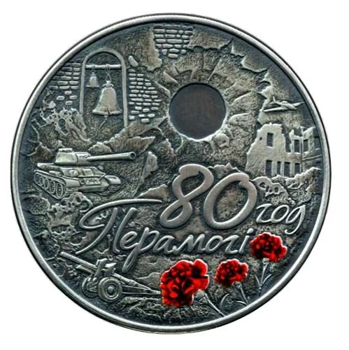 A stylized bullet hole, bells, and military gear on ruins, with three red carnations below.