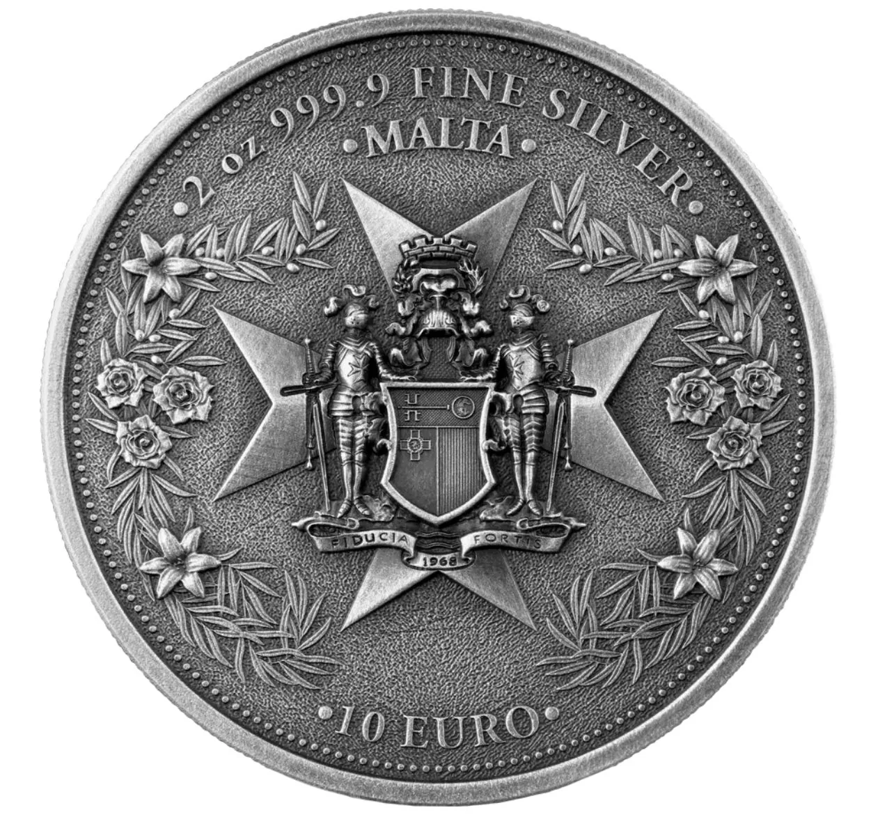 Description: Coat of Arms of the Central Bank of Malta, featuring a Maltese cross behind it and a wreath of palm, olive branches, roses, and lilies on each side.