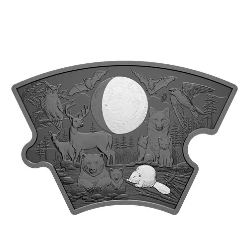 Inspired by the lunar cycle, this puzzle piece features a black rhodium plating to create a nocturnal setting. All pieces share an engraved forest motif. On the coin, the plating selectively conceals the engraving to reveal a Moon phase and a Canadian twilight animal—here, a waxing gibbous Moon with a North American beaver.