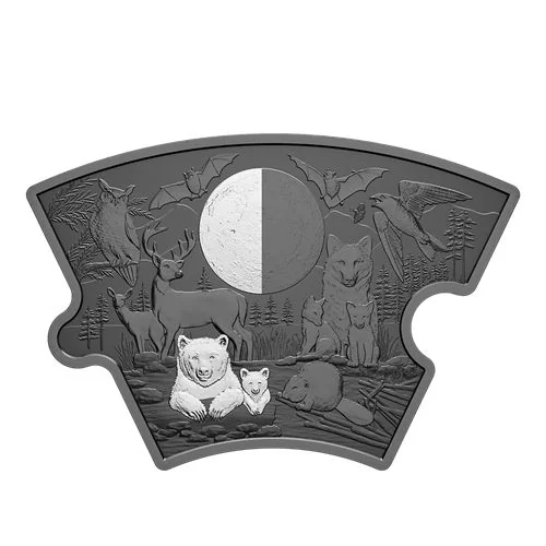 Inspired by the lunar cycle, these black rhodium-plated puzzle pieces feature an engraved forest. The coin uses selective plating to reveal a specific moon phase and a Canadian twilight animal—here, a grizzly bear for the third quarter.