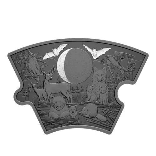 Inspired by the lunar cycle, this puzzle piece features a black rhodium plating to create a nocturnal setting. The shared engraved forest motif is partially concealed by the plating to reveal a specific Moon phase and a Canadian twilight animal—like little brown bats for the waning crescent.