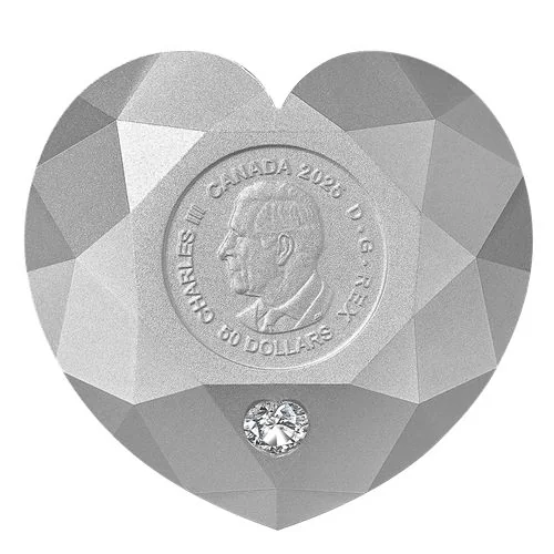 Inspired by a patented Crossworks diamond cut, this coin’s shape and facets draw from a 0.23 ct. Ideal Cut Heart Diamond. The table facet features the year "2025," "50 DOLLARS," and the effigy of King Charles III.