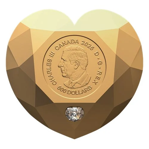 Featuring Crossworks Manufacturing's patented diamond cut, this coin's shape and facets draw inspiration from a 0.23 ct. Ideal Cut Heart Diamond. The table facet displays the year "2025," denomination "500 DOLLARS," and the effigy of King Charles III.
