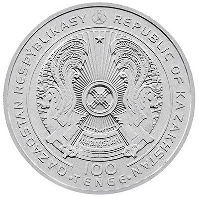 The coin features national ornaments around its edge, the State Emblem of Kazakhstan at its center surrounded by the country's name in Kazakh and English, and the denomination at the bottom.