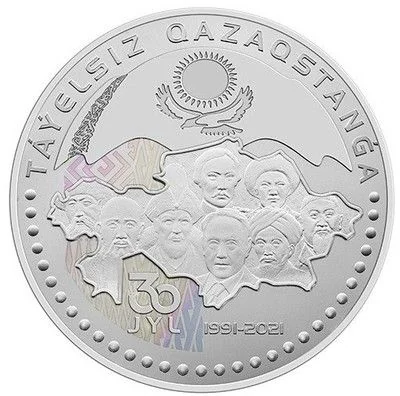 The coin's design completes the portrait series from Kazakhstan's 1993 banknotes, marking a national anniversary.