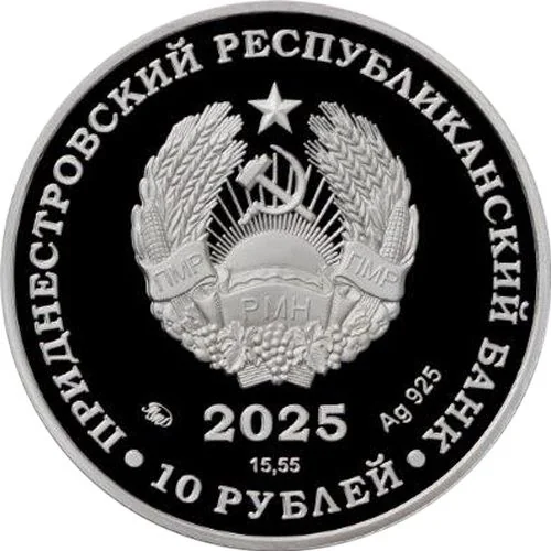Center: State Emblem of the Pridnestrovian Moldavian Republic. Circular inscriptions: top – "PRIDNESTROVIAN REPUBLICAN BANK", bottom – "10 RUBLES". Below emblem: issue year "2025", metal weight, left – mint mark, right – metal and fineness.