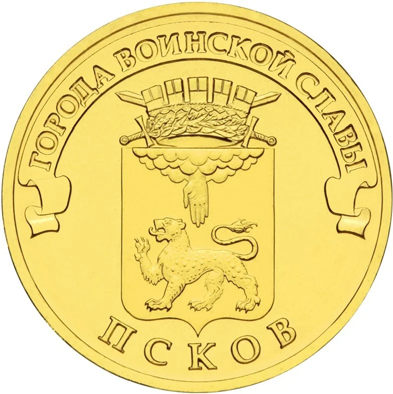 Pskov's coat of arms, above it the inscription "ГОРОДА ВОИНСКОЙ СЛАВЫ" on a ribbon, below "ПСКОВ".