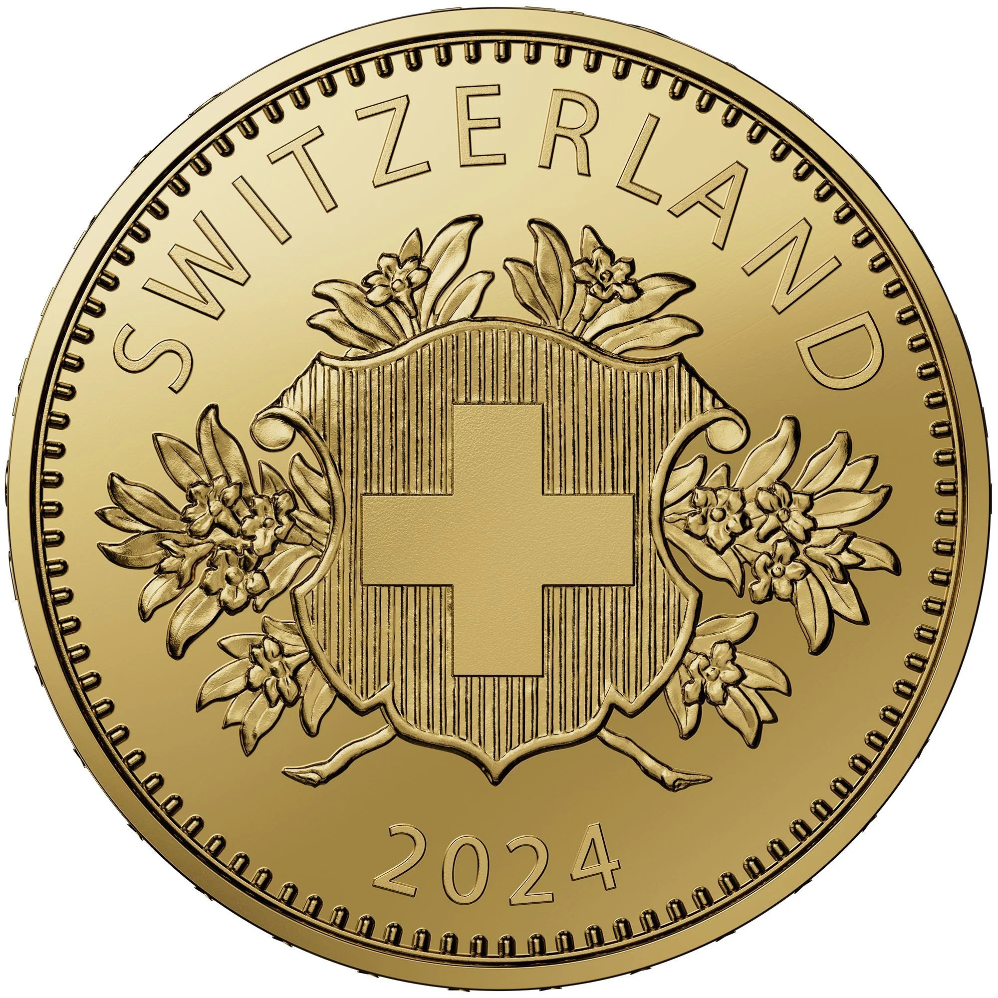 Swiss coat of arms centered, flanked by alpenrose stems.