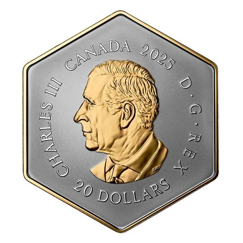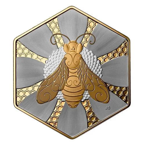 This reverse design by Canadian artist June Steube features a honey bee (Apis mellifera) at the centre of a stylized flower, highlighting its role as a pollinator. An overhead view shows its detailed wing pattern, while a honeycomb background mirrors the coin’s hexagonal shape. The bee, honeycomb, and rims are plated in yellow gold.