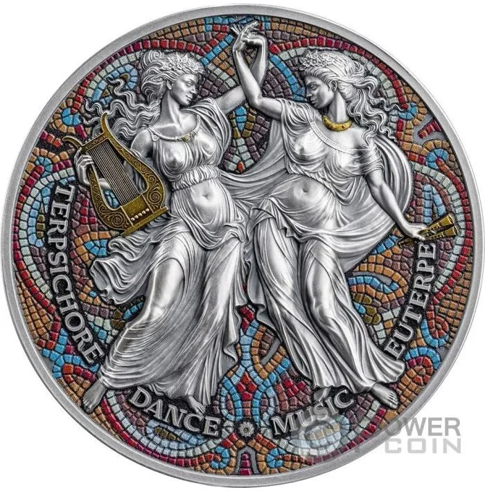 Two dancing muses: Terpsichore with a lyre, Euterpe crowned in laurel.