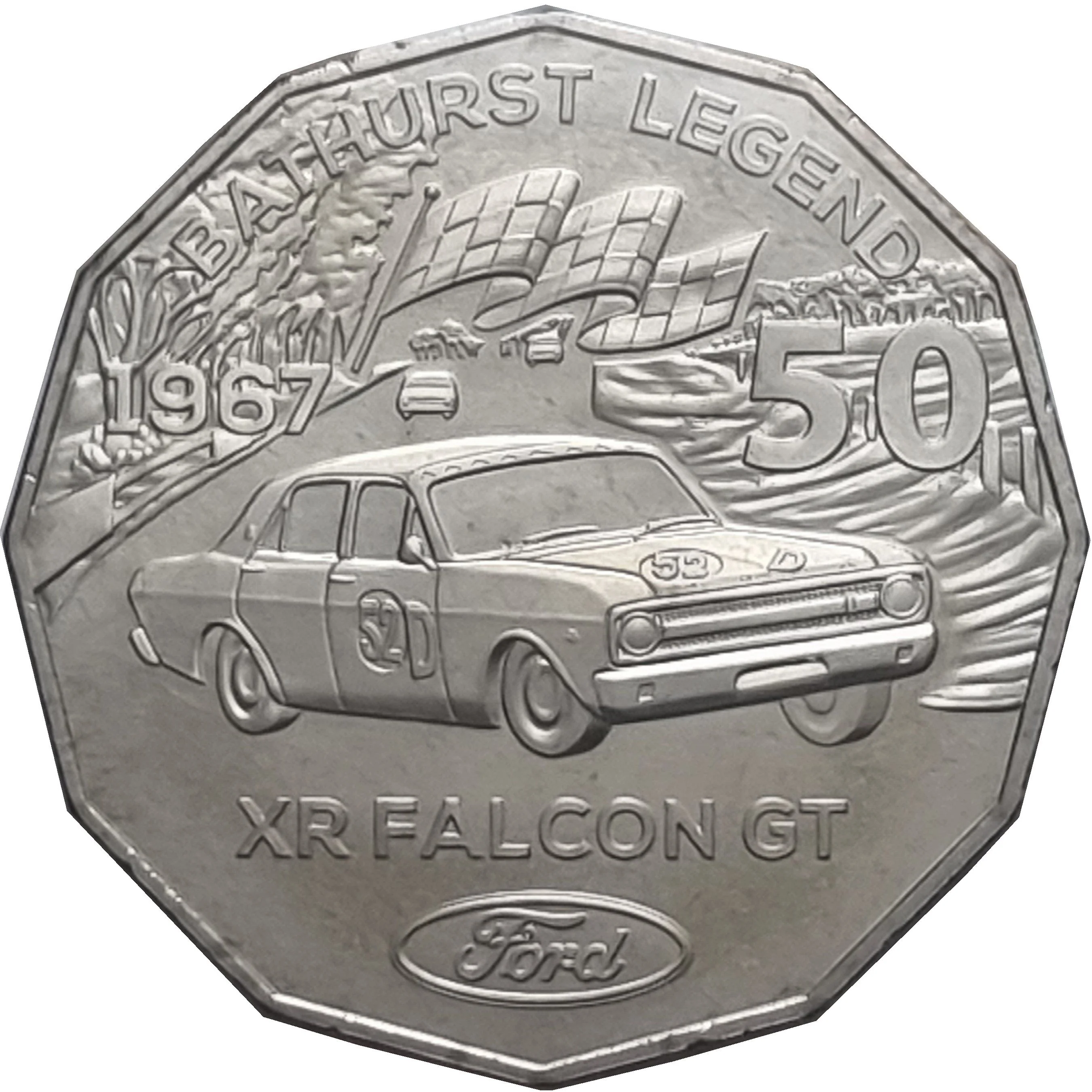 1967 XR Falcon GT racing on track, trees top left, chequered flag above, cars behind, Ford logo below.