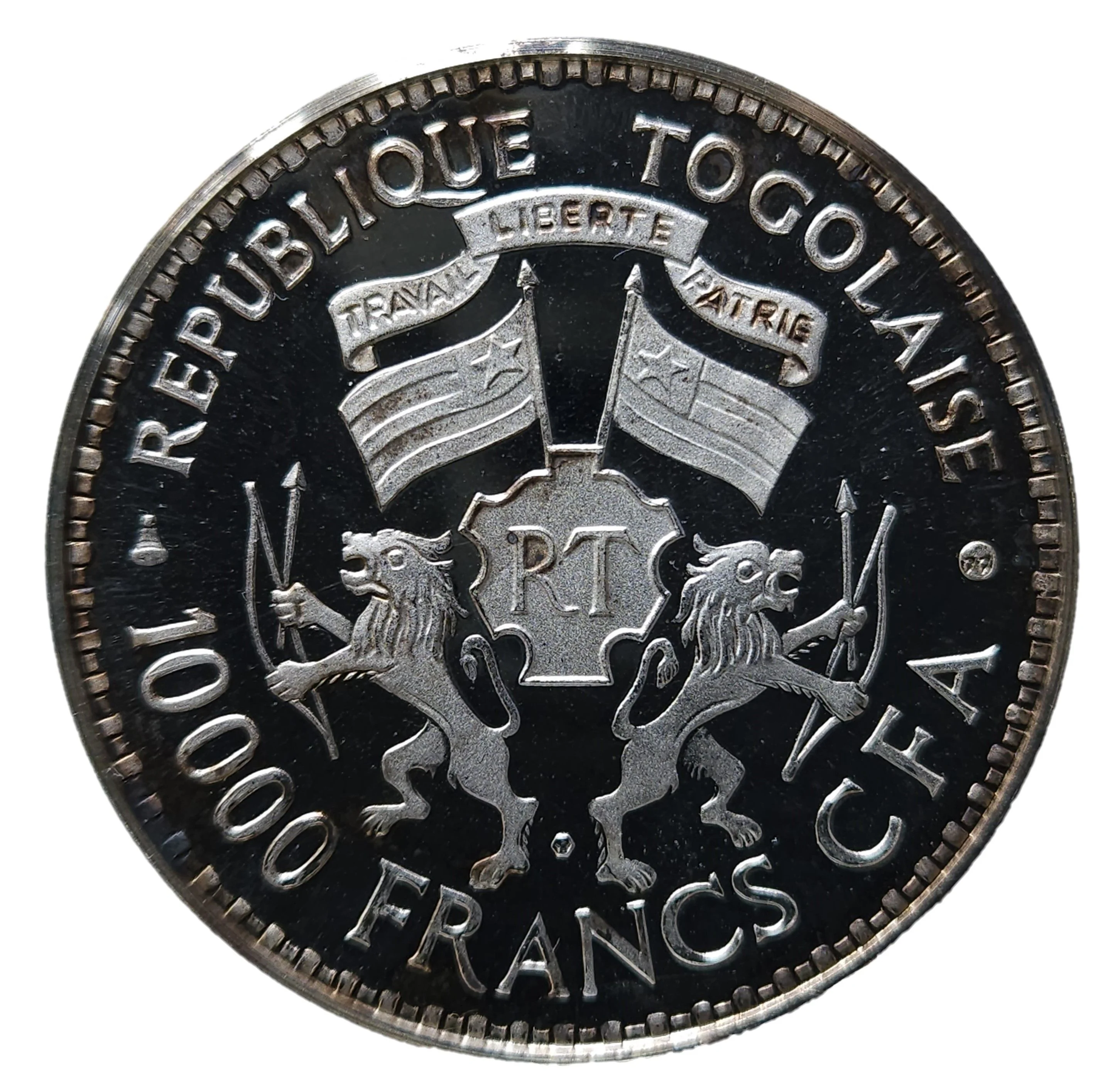 Togo's coat of arms, with a left bell mintmark, year to the right, a mintmark under the lion, and denomination below.