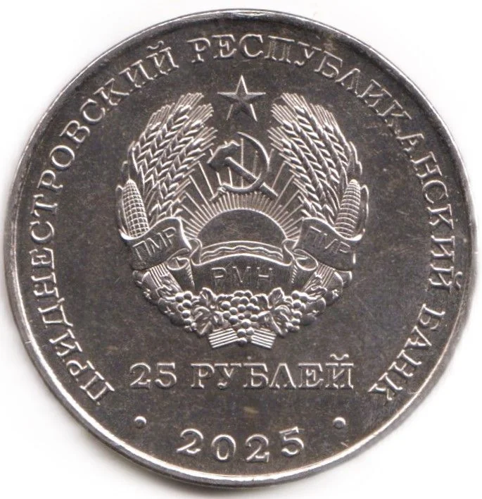 Central: State Emblem of the Pridnestrovian Moldavian Republic. Below: "25 RUBLES". Around top: "PRIDNESTROVIAN REPUBLICAN BANK". Bottom: year "2025".