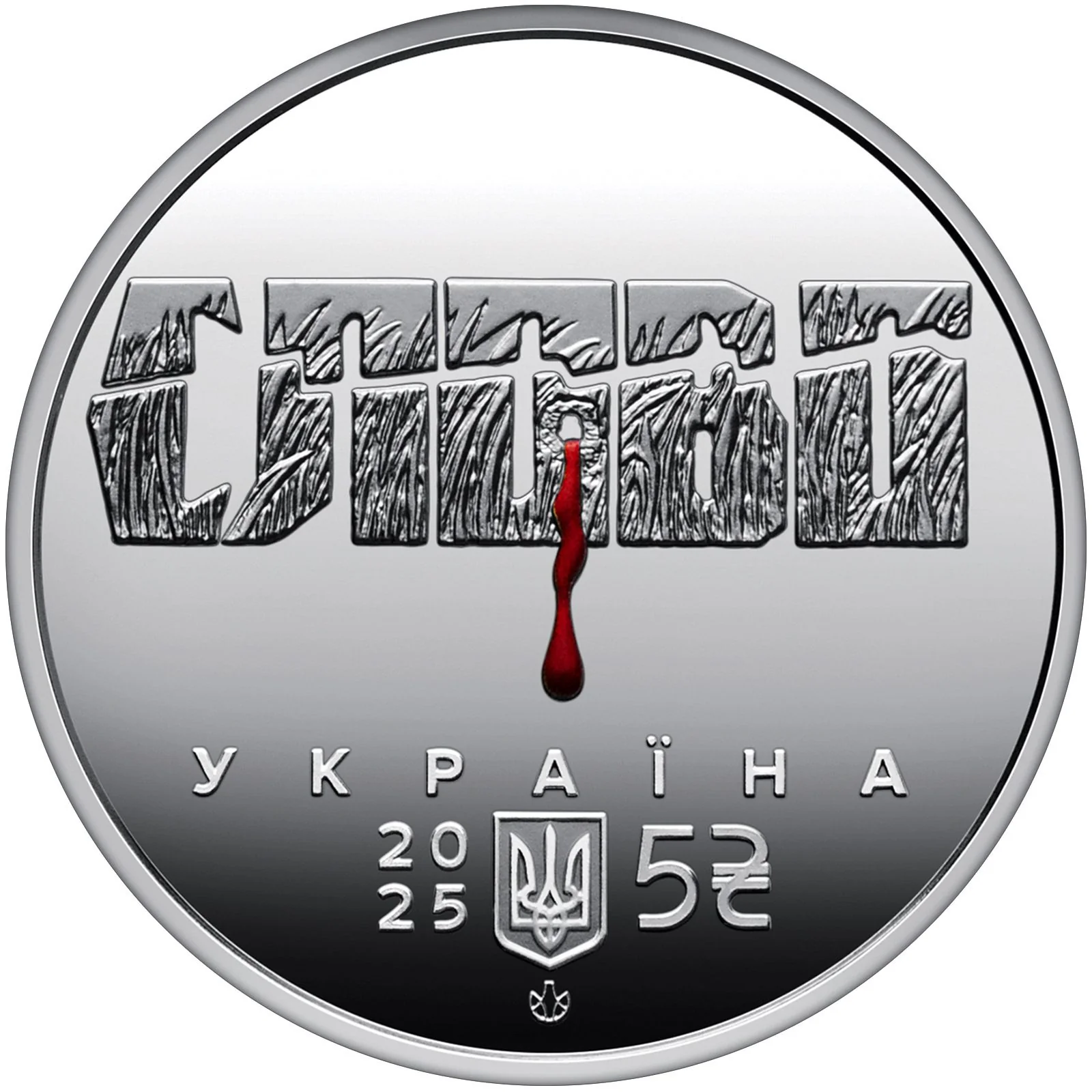 "СЛОВО" (Ukrainian for "word") was the Kharkiv House of Writers in the 1930s. Its letters, textured like winter wheat sprouts, represent the young artists whose lives were destroyed by the totalitarian regime. A bullet hole through the "O" bleeds, symbolizing this national wound and their lost potential.