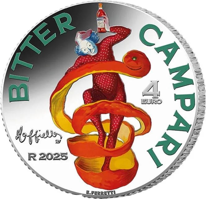 Centered is the iconic orange-peel spirit poster, surrounded by "BITTER CAMPARI". At bottom left: "CAPPIELLO", the Rome Mint "R", and "2025". At right: the "4 EURO" value. Bottom center: engraver "E.FERRETTI". A colorized coin.