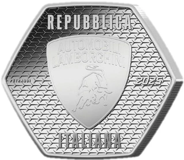 Centered, the manufacturer's logo. A stretched "Y", a Lamborghini design motif, forms the background. "2025" is on the right; the designer's signature "S.PETRASSI" is on the left. "REPUBBLICA ITALIANA" arches along the top and bottom.