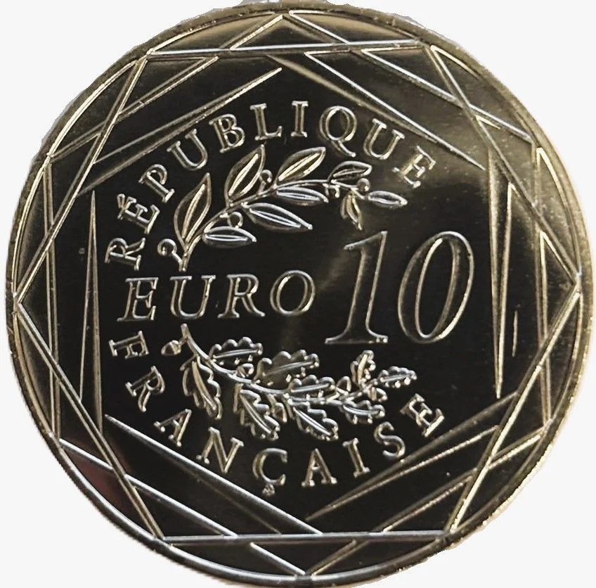 "10 EURO" flanked by laurel and oak branches, within three hexagons inscribed "RÉPUBLIQUE FRANÇAISE" and the year.