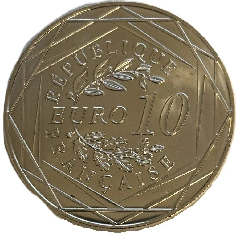 "10 EURO" flanked by laurel and oak branches, with "RÉPUBLIQUE FRANÇAISE" inscribed in three hexagons.