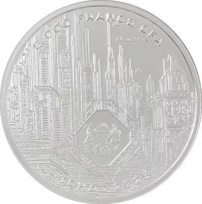 Features Chad's coat of arms with a futuristic cityscape, face value, and date.