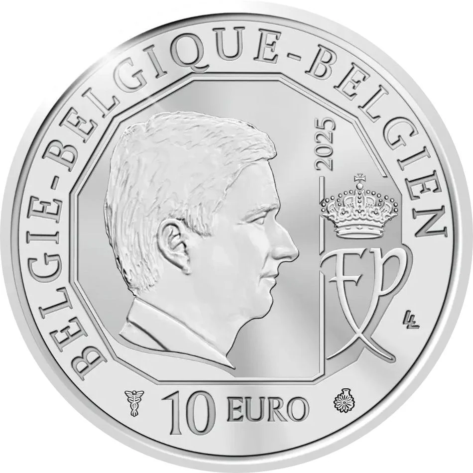 King Philip facing right, with his monogram and 2025, inside an eleven-sided frame. The edge bears the country name, mint marks, and value.
