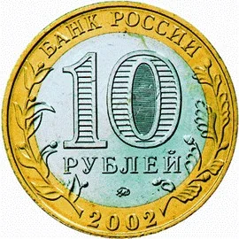 Center: "10 РУБЛЕЙ" (10 ROUBLES). Inside the "0", hidden images of "10" and "РУБ" (RUB) appear when tilted. Below: mint mark. Ring: top - "БАНК РОССИИ" (BANK OF RUSSIA), bottom - "2002", left/right - stylized plant stems extending onto the disc.