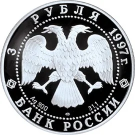 Artist I. Bilibin's two-headed eagle design. Rim inscriptions: top — "3 РУБЛЯ 1997 г.", bottom — "БАНК РОССИИ". Letters below indicate metal, fineness, weight, and mint mark.