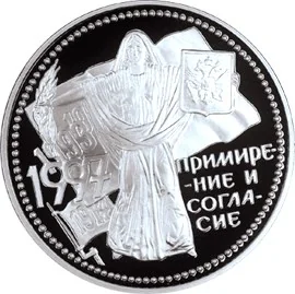 A woman stands before a flag, holding an olive branch and a shield with the Coat of Arms. The text "RECONCILIATION AND CONCORD" is to the right, with the dates 1917, 19 , 1993, and 1997 on the flag to the left.