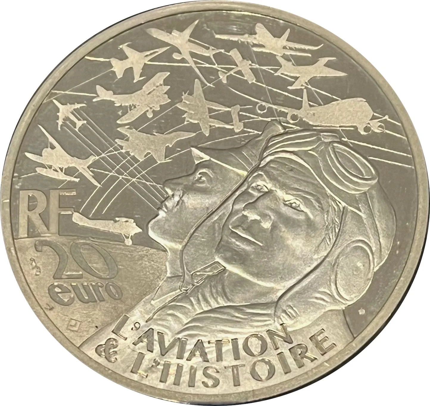 Two pilots represent civil and military aviation across eras, with historic aircraft filling the sky. The reverse features the face value and "RF" symbol.