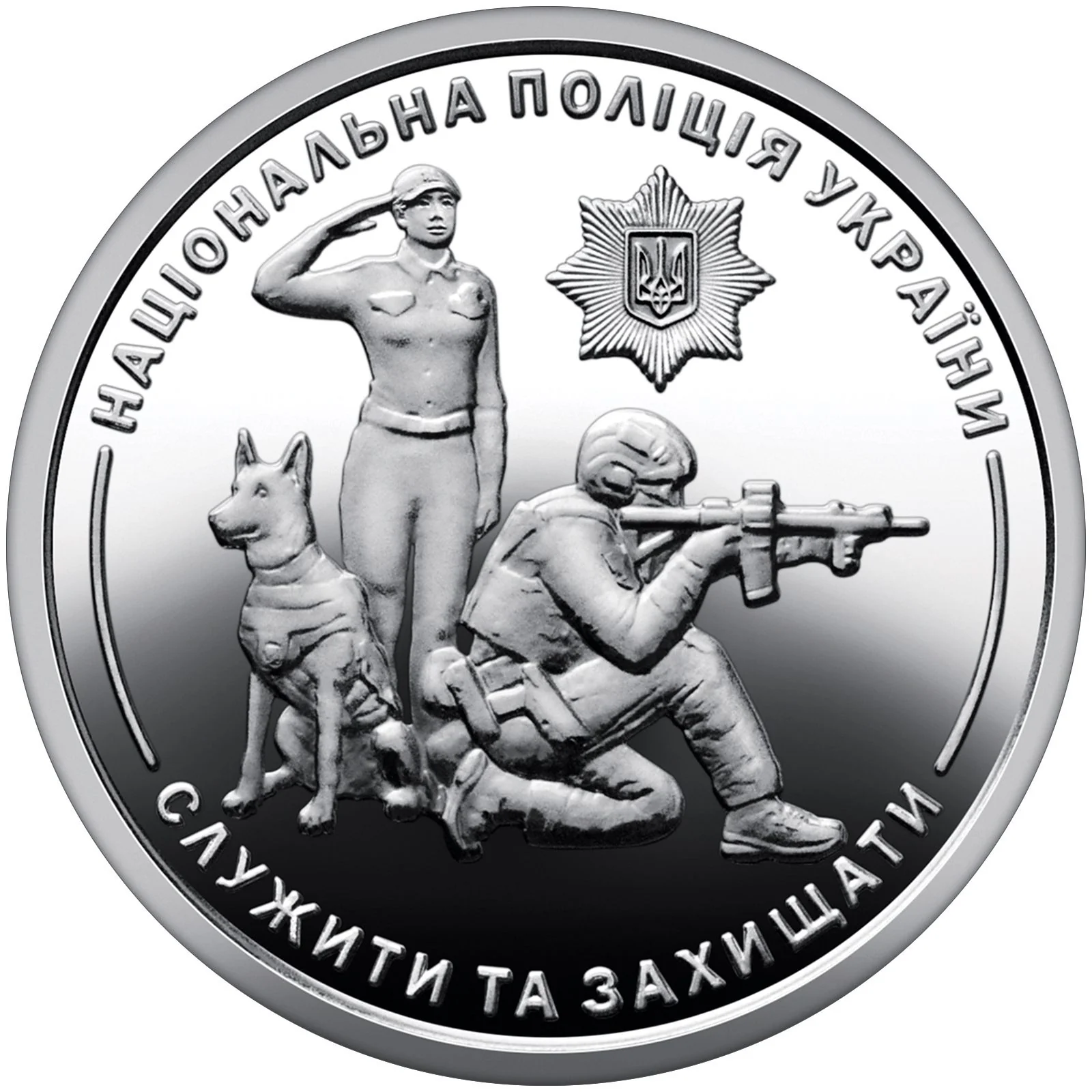 Ukrainian police representatives; emblem above, slogan below.
