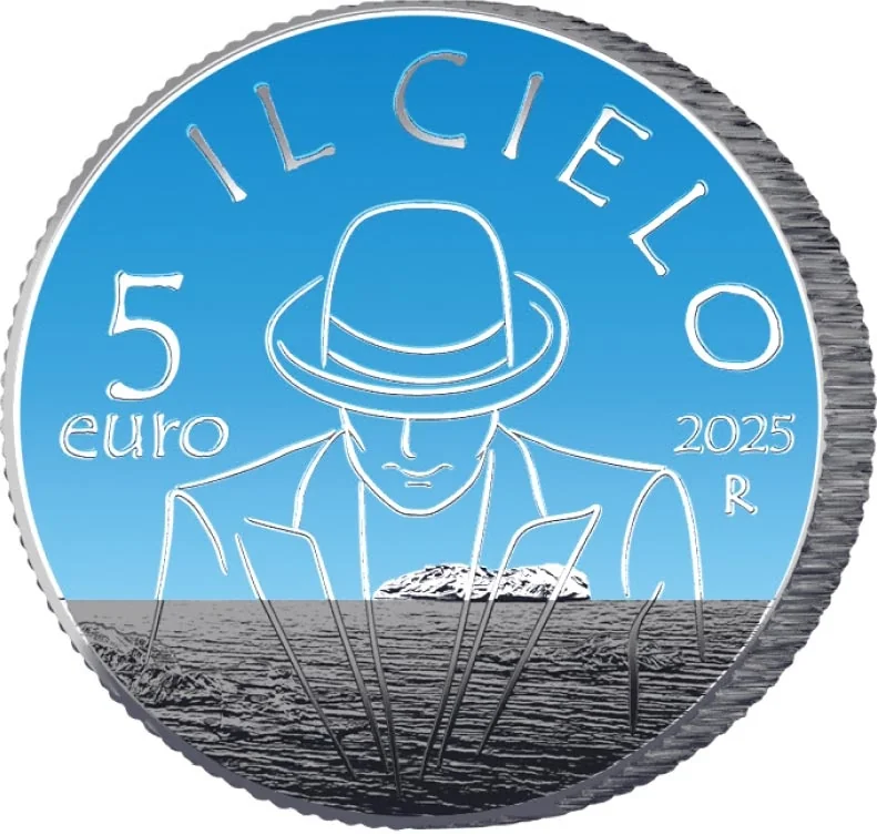 The rhodium-plated, color-accented coin features a stylized outline of Renato Zero in an iconic pose against the sky and sea that inspired him. The arch-shaped design includes the title "IL CIELO" above, with "5 EURO" on the left and "2025 R" (Rome Mint) on the right.