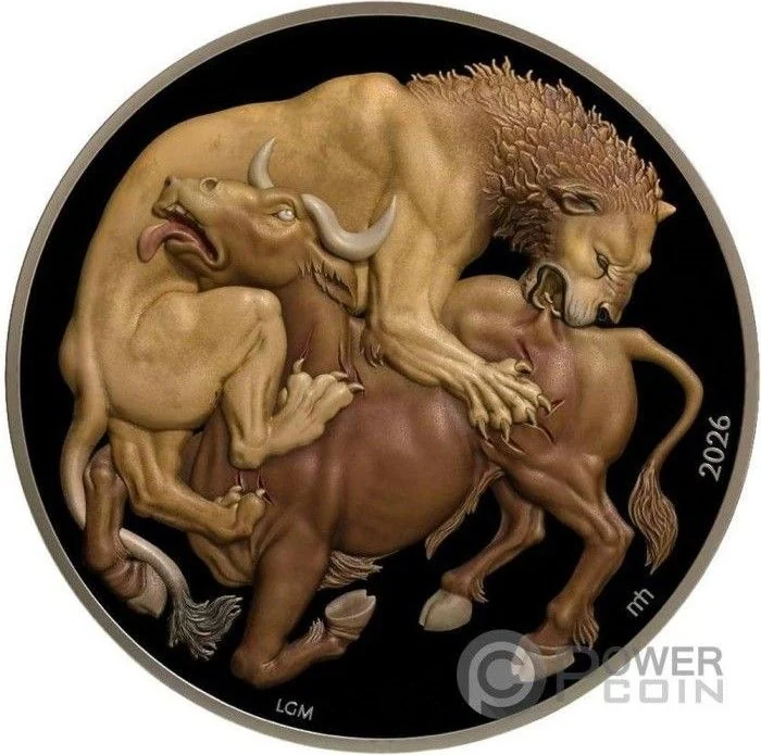 Colourized lion and bull fight at center.