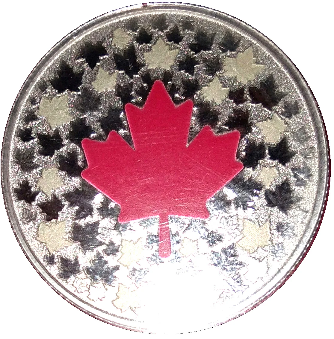 Large red maple leaf engraving centered, surrounded by smaller ones.