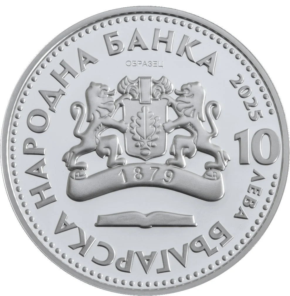 Obverse: central BNB logo with '1879' on its strip above a stylized open book. Circumference: inscriptions "БЪЛГАРСКА НАРОДНА БАНКА," issue year "2025," and denomination "10 ЛЕВА."