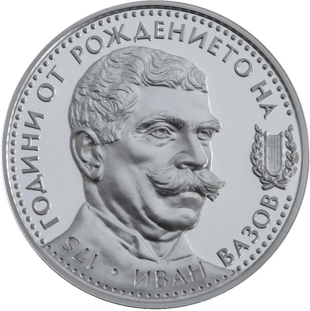 Reverse: Portrait of Ivan Vazov. Encircled by the inscription '175 ГОДИНИ ОТ РОЖДЕНИЕТО НА ИВАН ВАЗОВ' and a lyre-shaped laurel wreath with a book.