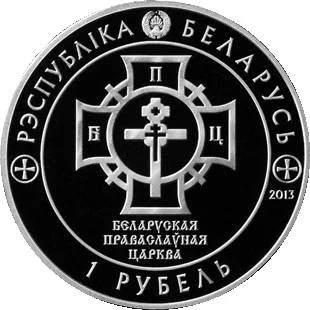 Description: Belarus's coat of arms above, the Belarusian Orthodox Church's logo within a circular center design, with inscriptions above and below, the date to the right, and the denomination at the bottom.