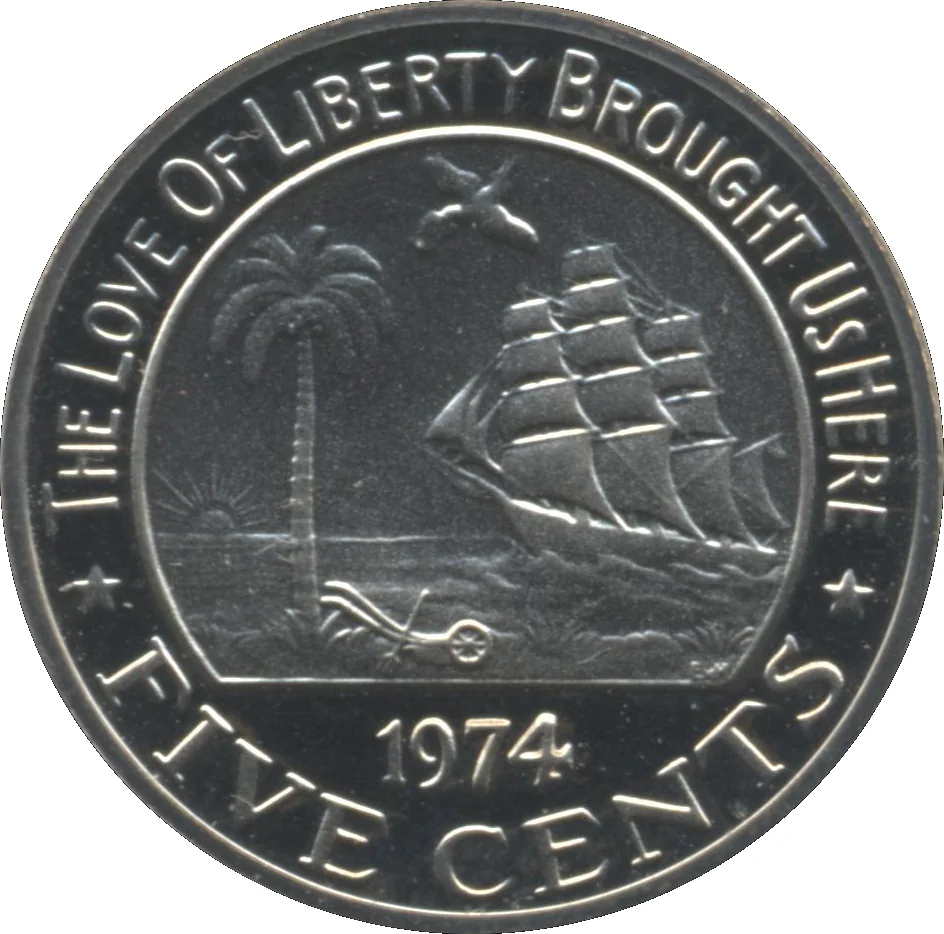 Liberia's coat of arms in a circle, featuring a palm tree, sunrise, dove, plow, and sailing ship. Encircled by the national motto, with value and date below.