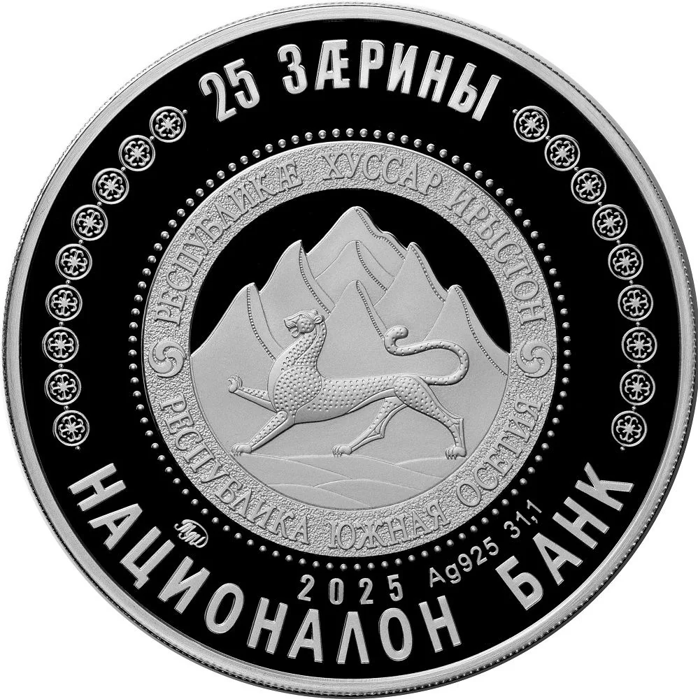 Description: A golden "80" on a ruby star with golden rays, above "GREAT VICTORY." Below, the Tskhinvali Eternal Flame monument with dates "1945" and "2025." On the left, the inscription "NO ONE IS FORGOTTEN, NOTHING IS FORGOTTEN" and eight gilt stars for the eight decades since Victory.