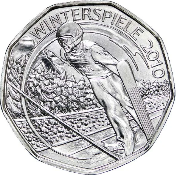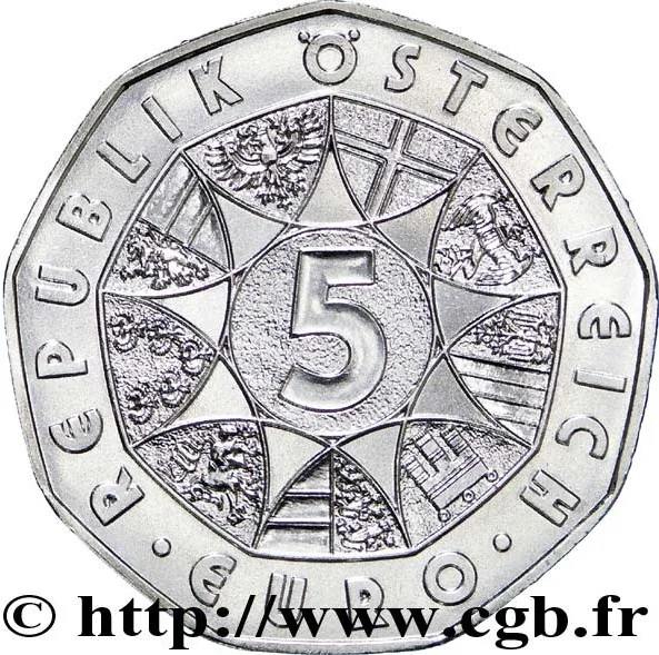 The design, inspired by Austria's old 50 schilling coins, features the "5 EURO" value encircled by the nine provincial coats of arms and the inscription "REPUBLIK ÖSTERREICH."