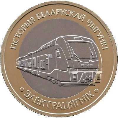 Description: A steam locomotive is centered within a circle. Around the top it reads "HISTORY OF BELARUSIAN RAILWAYS" and around the bottom, "ELECTRIC TRAIN".
